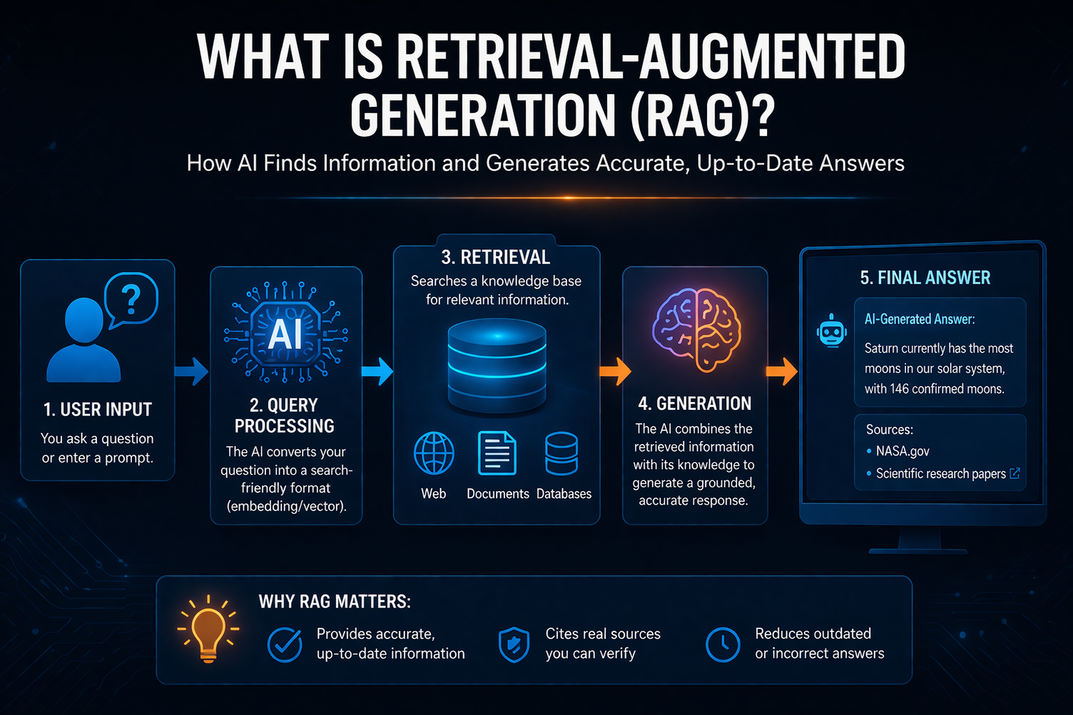 The process is more straightforward than the name suggests. Here's what happens behind the scenes when you ask an AI a question that uses RAG: